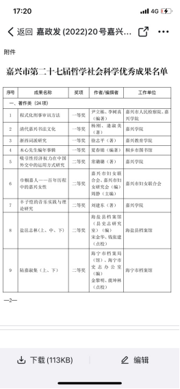 据悉,嘉兴市第二十七届哲学社会科学优秀成果经市哲学社会科学优秀成果评审委员会评审、市哲学社会科学工作领导小组审定,共评出一等奖、二等奖、三等奖共47项,其中著作类24项、论文类23项。