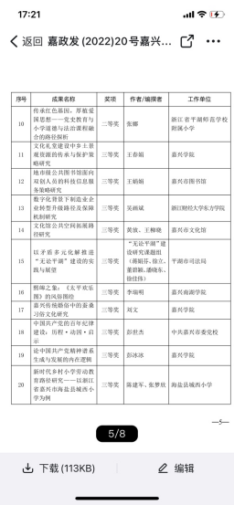 其中,杨刚老师的成果《清代嘉兴书法文化》获得著作类一等奖,王春娟的成果《文化礼堂建设中乡土景观资源的传承与保护策略研究》、刘文老师的成果《嘉兴传统婚俗中的蚕桑习俗文化研究》分别获得论文类三等奖。