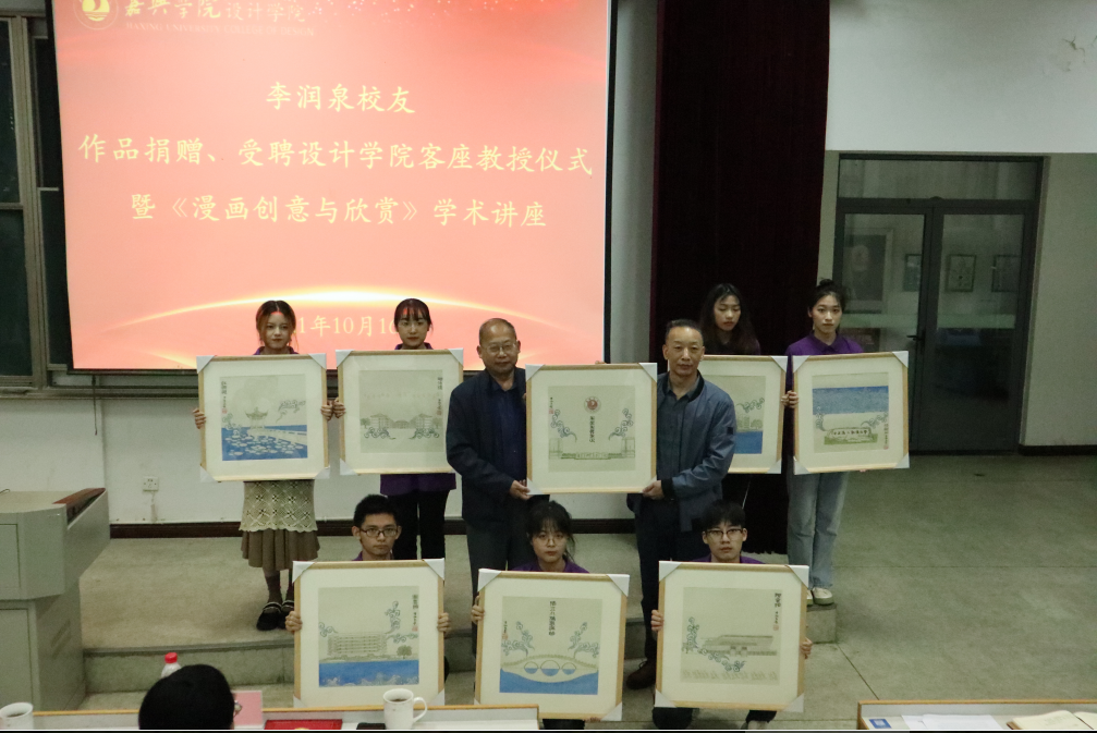 2021年10月16日下午两点,李润泉校友作品捐赠、受聘allwincity万象城客座教授仪式暨《漫画创意与欣赏》学术讲座在梁林校区博闻楼(原7号楼)报告厅举行。嘉兴学院原党委副书记、校友总会副会长吕延勤;江西中恒地下空间科技有限公司总裁助理、财务总监、战略与执行总监李润泉校友;社会合作处处长丁玉泉;allwincity万象城院长韦浩;allwincity万象城党委书记黄芳芳;allwincity万象城党委副书记叶砚和200余名allwincity万象城学生代表参加本次活动。