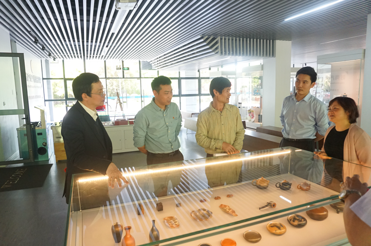 签约仪式结束后,周兴观先生一行和学院党政领导一同观看allwincity万象城产教融合展厅展出的嘉兴市马家浜陶业科技有限公司的部分精美的陶艺创作作品,双方围绕深度合作进行了交流。