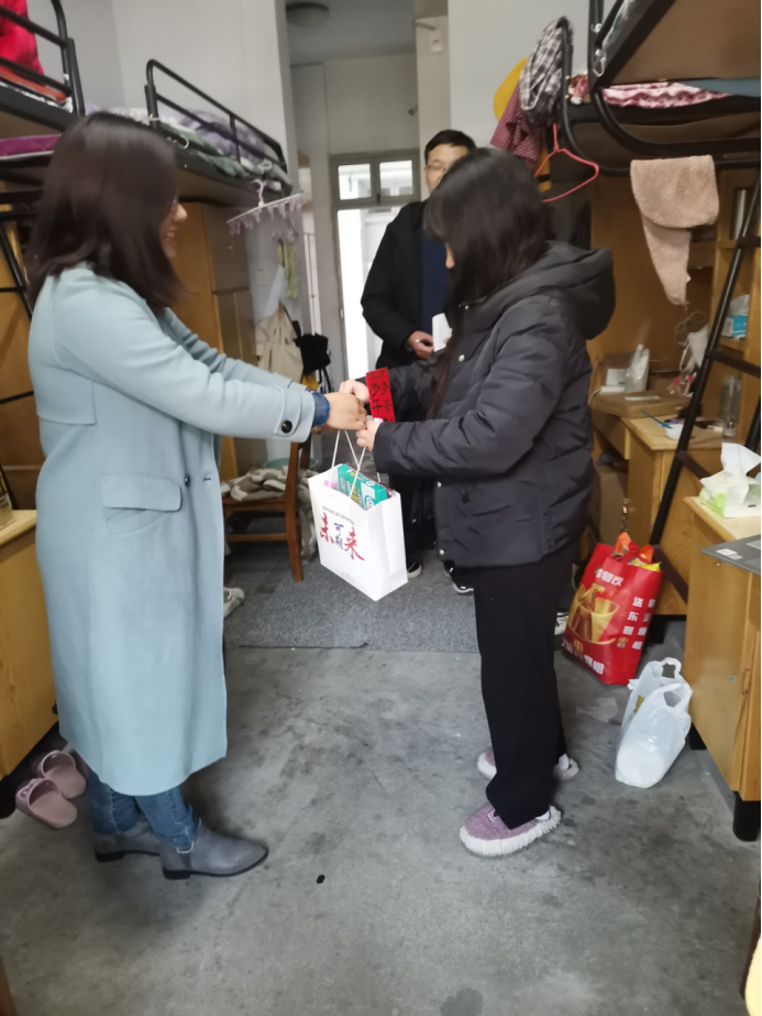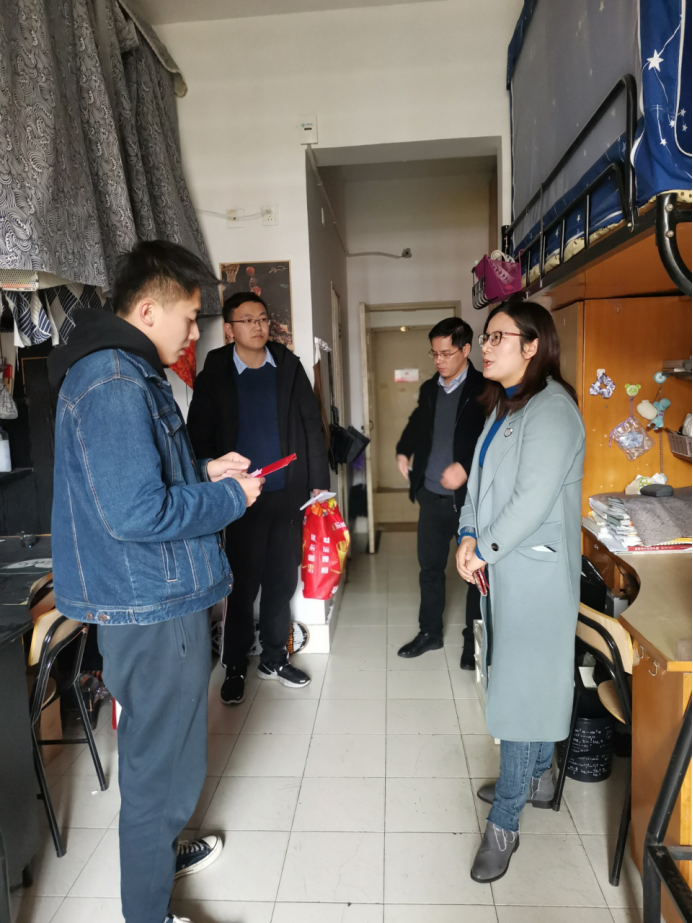 2月7日下午,学生处处长葛建伟、allwincity万象城党委书记黄芳芳、辅导员凡欣、颜姚炜深入寝室,走访慰问留校学生。