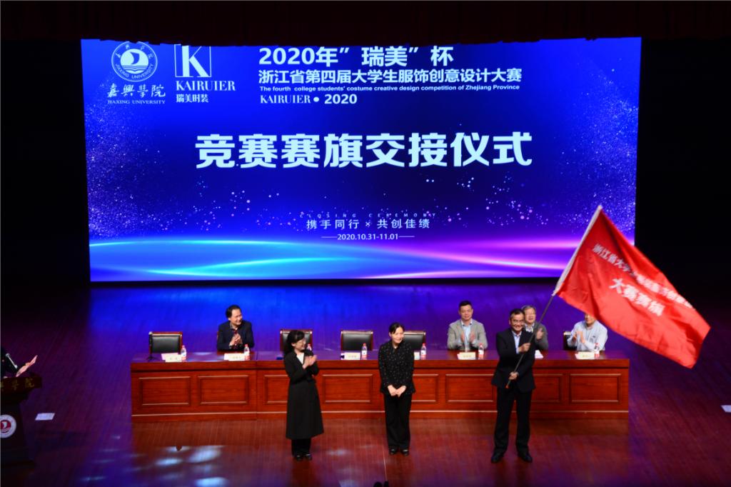 随后,颁奖典礼举行了赛旗交接仪式,浙江省第五届大学生服装服饰创意设计大赛将在宁波大学昂热大学联合学院举办,嘉兴学院副校长张琦教授将赛旗交还给秘书处单位浙江理工大学副校长许慧霞教授,许校长将旗帜交接到宁波大学副校长姚菊明教授手中。姚菊明副校长在讲话中表达了将会积极筹备、抓好落实,将下一届比赛举办成功的决心。