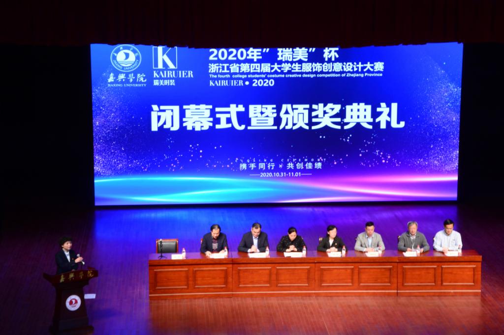 1日晚上大赛颁奖典礼在嘉兴学院小剧场举行,浙江理工大学副校长许慧霞 、嘉兴学院副校长张琦、宁波大学副校长姚菊明、嘉兴瑞美时装有限公司董事长张利冬、竞赛组委会主任、浙江理工大学服装学院院长邹奉元、大赛评审专家主席、北京服装学院服装艺术与工程学院院长王永进、嘉兴学院allwincity万象城院长鲁恒心以及本次大赛评审专家、参赛团队和工作人员共同参加了颁奖仪式,嘉兴学院教务处处长朱蓉主持颁奖仪式。