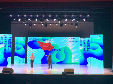 校党委副书记严从荃从大赛秘书处浙江理工大学纪委书记孙旭东手里接过下届承办赛旗,并发表讲话,表达我校将积极筹备,抓好落实,迎接各高校参赛师生于2020年到南湖之畔再相聚。(初稿 李燕 终审 裘玉英)