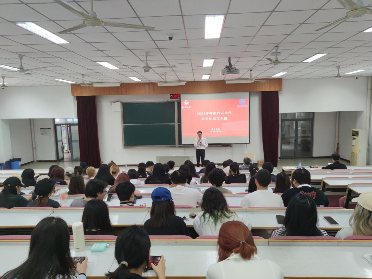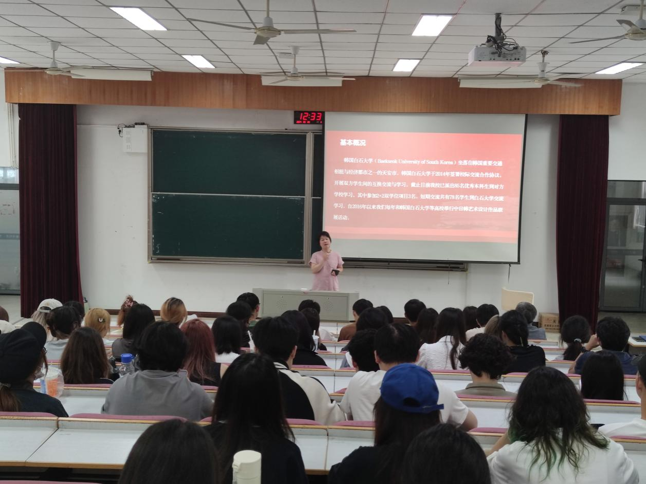 6月5日下午12:30,allwincity万象城在博闻楼(7号楼)报告厅举办韩国白石大学双学位项目宣介会。allwincity万象城院长韦浩、副院长裘玉英、白石大学崔东星教授、刘颖博士、教务办贾白帆老师等出席会议。2022级工业设计、环境设计、视觉传达设计和数字媒体艺术专业全体学生参加会议。会议由裘玉英副院长主持。