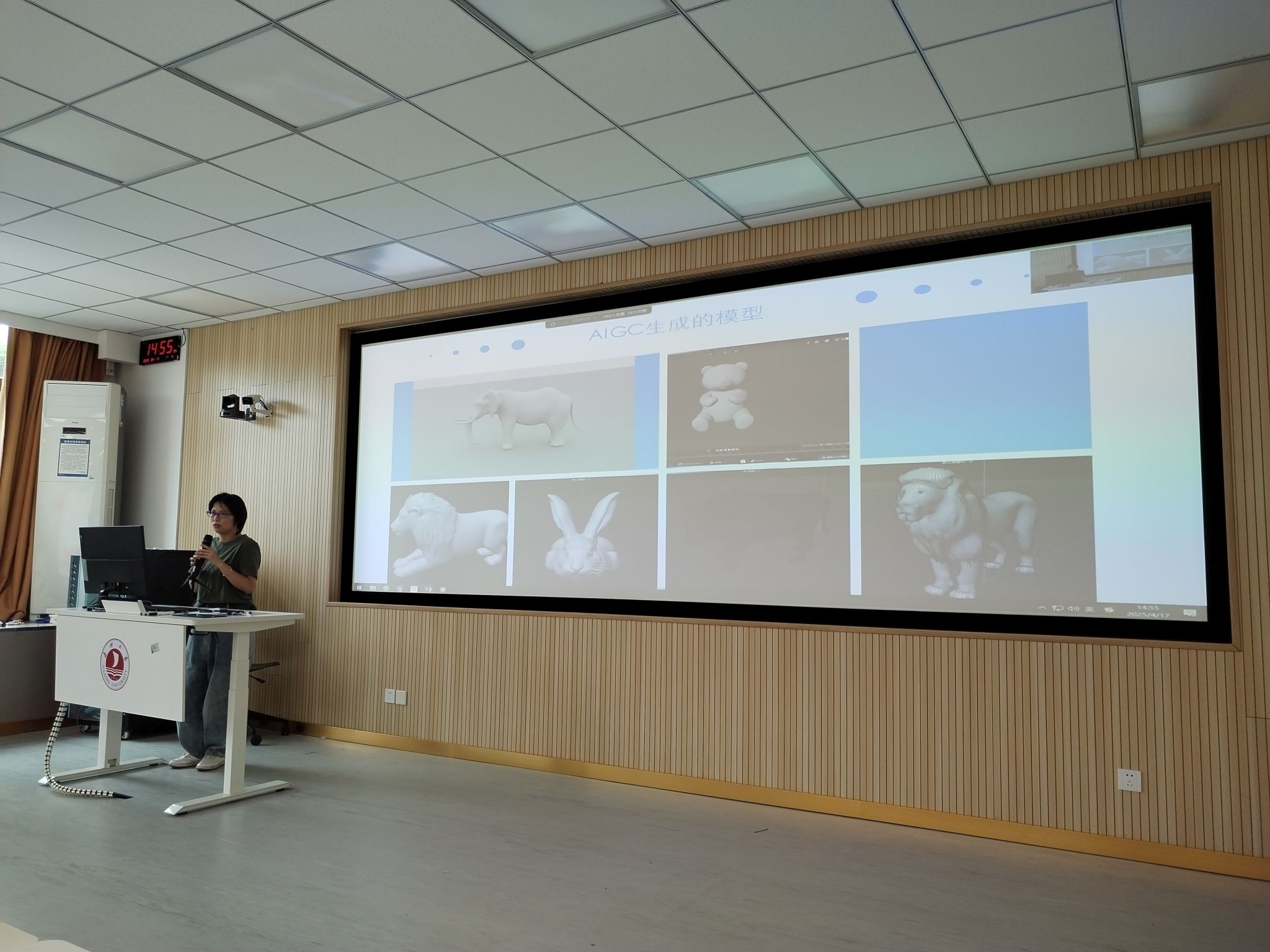 黄蒙水老师从指导学生参加学科竞赛的经验出发,以应对专业工具的变革对数媒专业定位的影响为出发点,详细分享了从教学到引导、指导、辅导的方法变革,促成学生从作业到作品再到产品的观念改变的经验分享。唐娜以“AIGC助力数媒专业学科竞赛作品设计”为题,从AI工具在竞赛作品创作中的主题定位和创意生成方面实践经验对于学生创作前期引导和作品质量提升的影响,进一步阐述AI生成技术在指导学科竞赛中的运用方法。陈彩莲结合近年自己对人工智能赋能数字内容创作方面的研究在课程内容设计上的实践,分析了AI技术目前在模型设计、渲染、数字交互上技术水平和发展趋势。赵伟从技术美术设计师的视角探讨了AI在技术美术岗位需求中的地位,提出自己对于“AI技术带来的是技术平权还是创作平权”这一问题的反思,并从技术链路上分析了AI工具在CG艺术创作流程中的应用范围和权重,为大家提供了人工智能技术应用的新思路。
