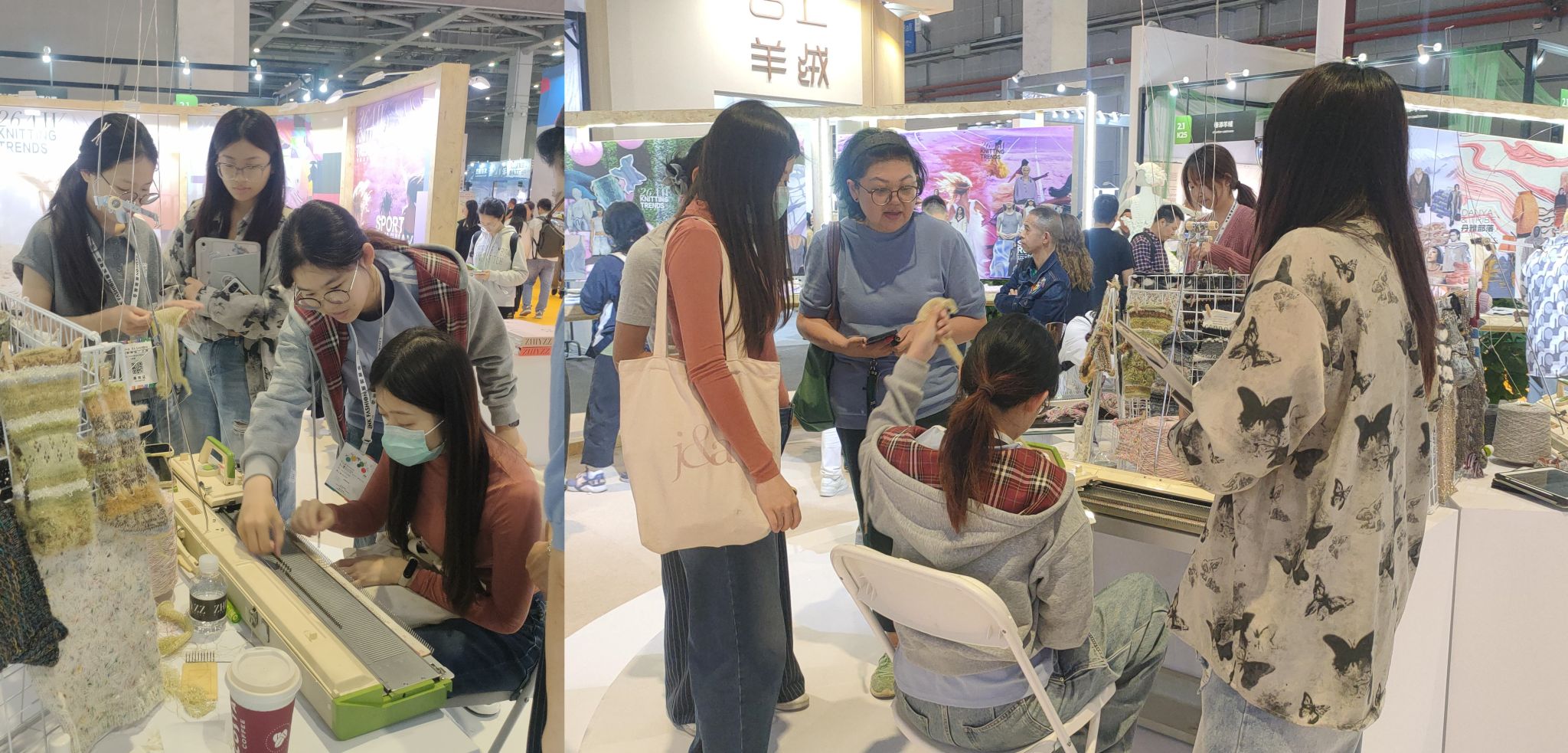 展区中央的三台手摇横机吸引了众多目光,万象城体育awcsport的学生陈星蓉、李烊垟、方心怡、曹宇航、王心怡正在现场演示手摇横机的操作,并与观众互动。他们表示,此次校企合作让企业和学校之间的融合更加紧密,极大地提升了专业技能和实践能力。