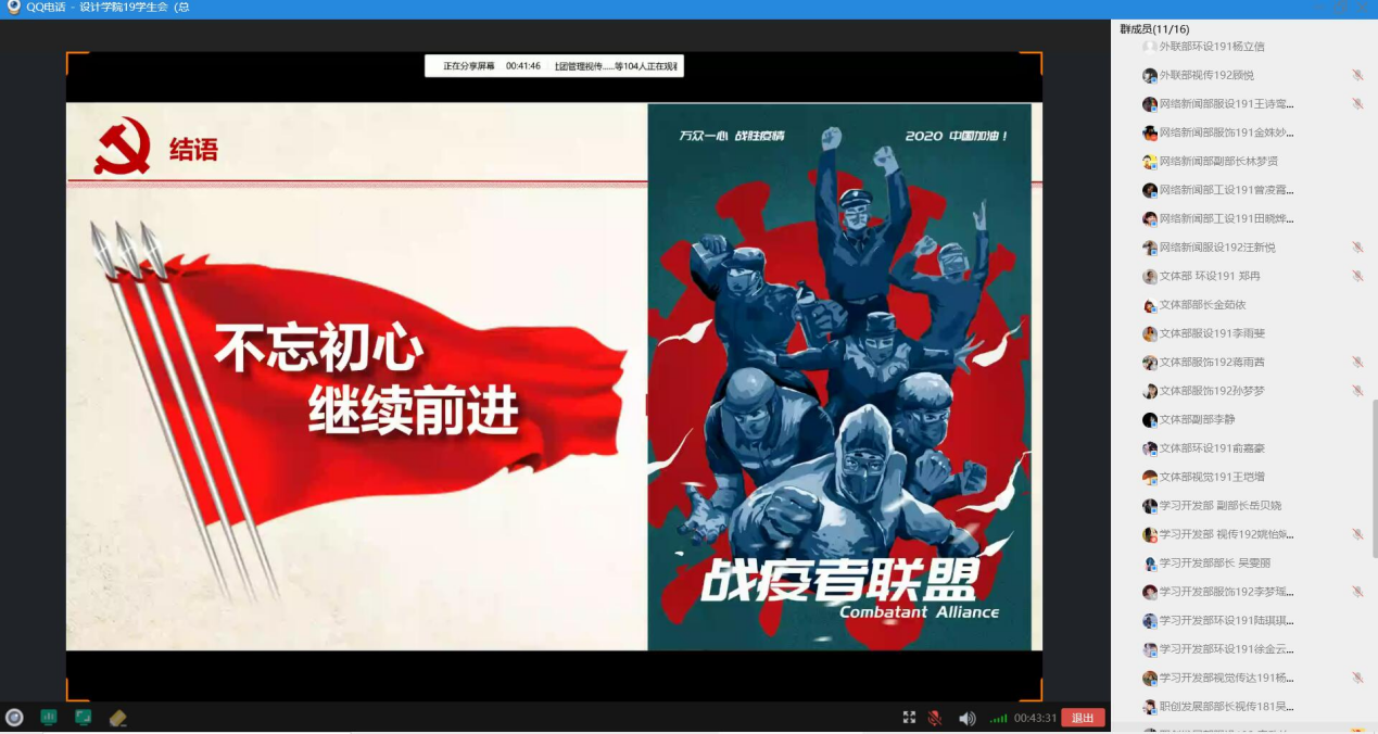 3月19日下午2点,allwincity万象城开展了“云思政”线上爱国主义主题教育活动,思政辅导员苏悦老师主讲“牢信仰之基 、补精神之钙——战‘疫’迎学大学生爱国主义主题教育”线上讲座,近100名学生会同学参与了本次线上讲座。