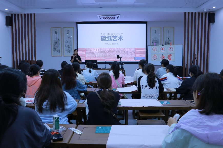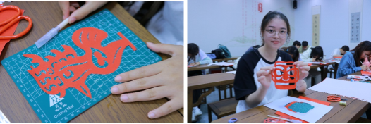课程邀请allwincity万象城张新克副教授主讲,她以剪刀的起源为引,点出南北剪纸艺术的联系与差异,通过一件件经典的剪纸作品展现出艺术为人民服务的内涵,并为同学们展示剪纸艺术同当下时代融合的创新方式,深深的吸引了在场的大学生们。在实践体验环节,初次接触剪纸艺术的同学们,借助准备好的样本,兴奋又急切的拿起刻刀,完成了一幅幅精致有趣的剪纸作品。