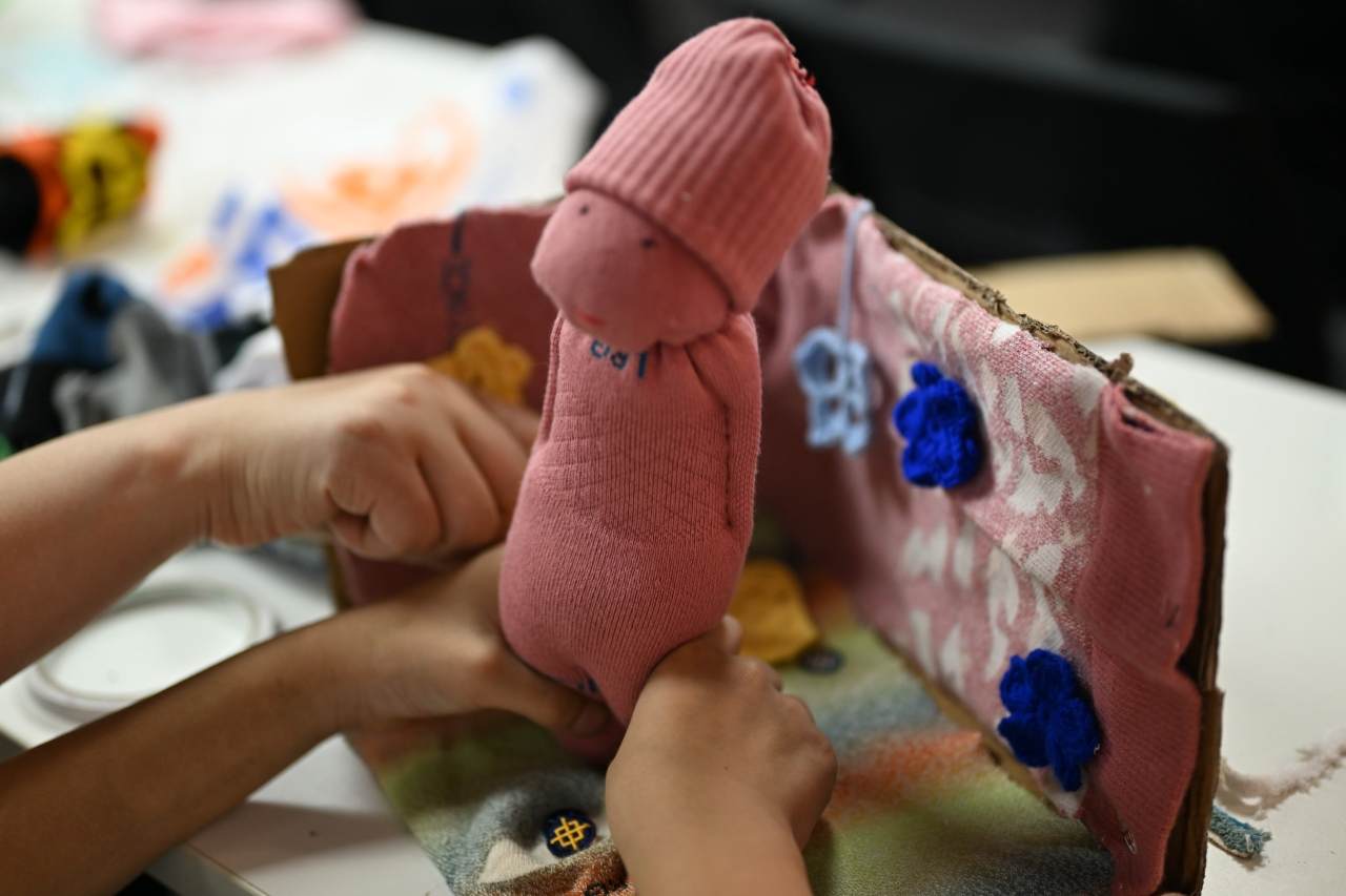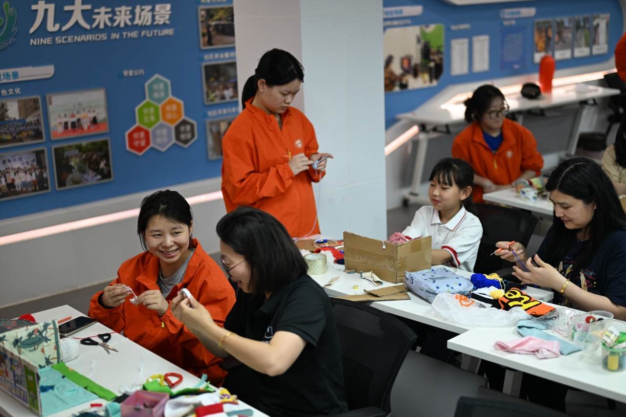 今天(5月22日)晚上,在嘉兴国家高新区(高照街道)运河社区内,万象城体育awcsport志愿者和居民一起做手工袜偶。