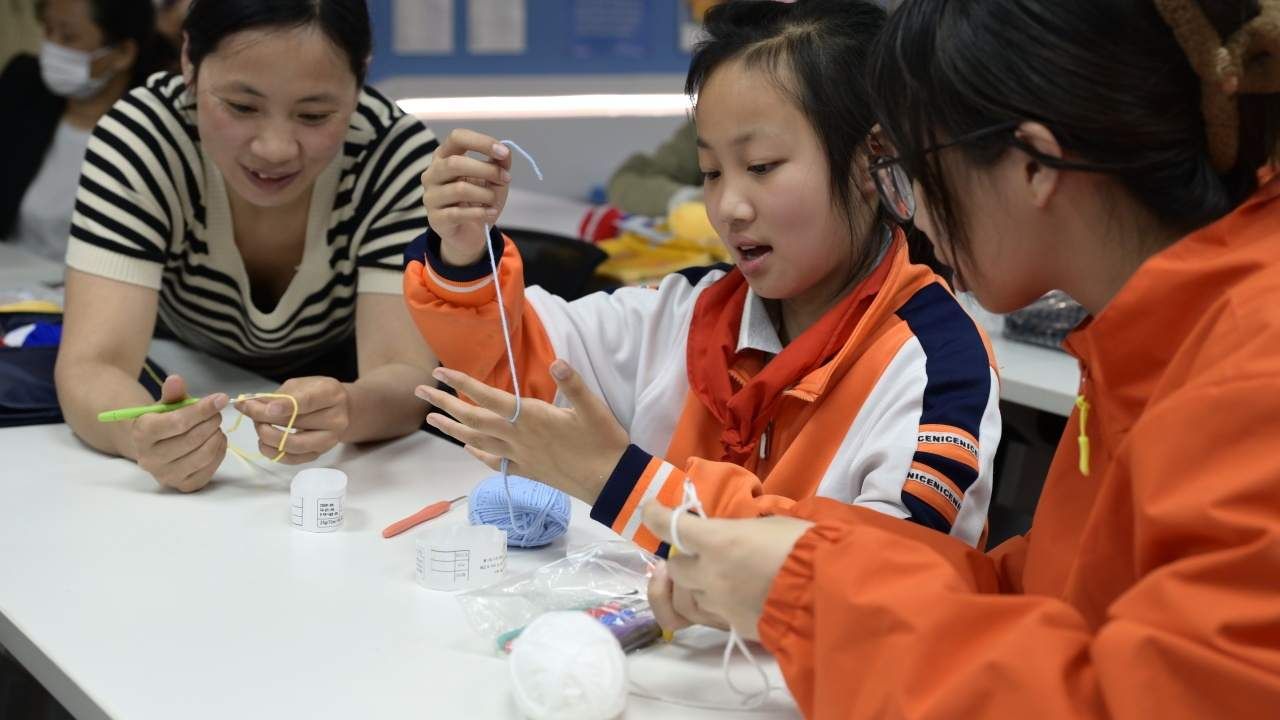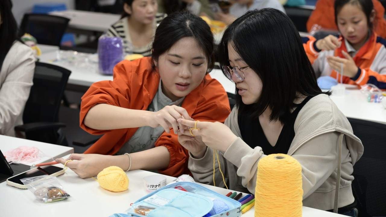 “袜偶”这一创意源自该校00后大学生群体,他们以钩针改造废旧棉袜,将艺术设计融入孤独症儿童疗愈实践,让专业技能焕发出人文温度。课堂上,职场青年们围坐在长桌旁,在大学生志愿者手把手的指导下学习勾线:有人将素色毛线勾勒出憨态可掬的动物,有人用绒球、纽扣点缀袜偶表情,三五成群讨论造型设计的欢声笑语中,不时传来发现针法窍门的轻呼声。