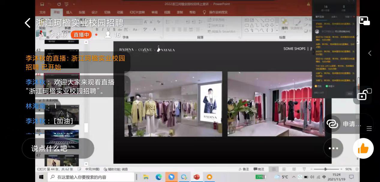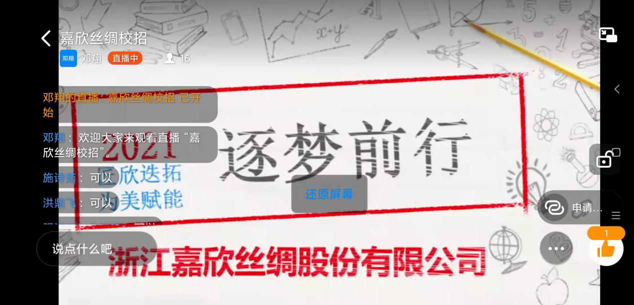 同学们一致认为:“参加线上招聘会,节约不少时间,而且企业类型多样,提供的岗位也多样,对学生来说选择余地更大。” 嘉欣丝绸有限公司招聘负责人邓总对本次招聘会的举办效果表示满意:“我司当天直播效果显著,最多在线观看人数45人,共收到有效投递简历5份。” 浙江辉吉青服饰(集团)有限公司人力资源经理胡总表示在招聘会前公司邮箱就已收到一位同学的求职简历,直播宣讲当天和这位同学经线上深入沟通,双方达成了明确意向。